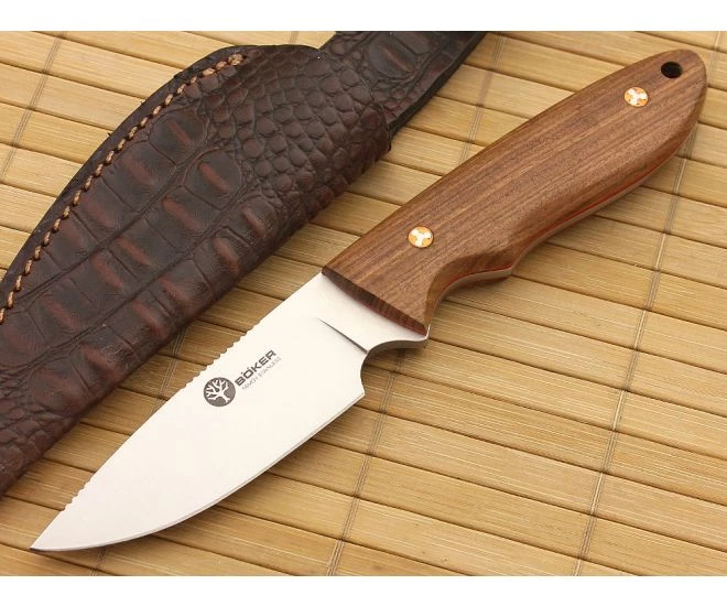 The Boker Arbolito Pine Creek fixed blade is a capable utility sized hunter. Hand crafted in Argentina, the full tang blade is composed of high quality T6MoV satin finished stainless steel. Various grip positions can easily combine with the thumb ramp and jimping near the tip of the blade help to provide a positive grip for delicate tasks while also maintaining comfort. Smooth Guayacan Ebony Wood handle scales have been attached to the tang with mosaic pins. The wood handle slabs sit over a red fiber liner giving the knife a bit of added character. Includes an embosses leather belt sheath with snap closure. Brand new directly from Boker.