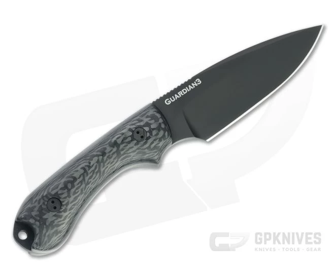 The Bradford Guardian3 is a compact, American made, everyday carry fixed blade that makes a perfect belt-carry companion for urban or outdoor use. Built to replace the modern EDC folding knife, the Guardian3 has a compact size that is easy to carry while still providing plenty of edge for your cutting needs. This GPKnives Exclusive has a false edge blade of black DLC coated CPM Rex 45 tool steel and 3D contoured carbon fiber handle scales.