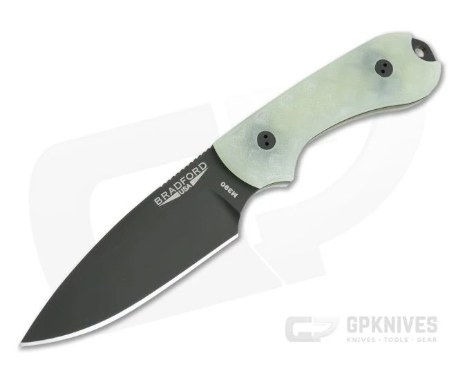The classic Guardian3 fixed blade from Bradford Knives comes with thick, textured G10 scales and a robust sabre ground M390 blade for exceptional everyday carry performance. The 3 is the perfect size to EDC or throw in your pack. It won’t weigh you down and offers plenty cutting edge to handle daily tasks. This version comes with a black DLC finish and translucent jade green or “Ghost” G10 scales.