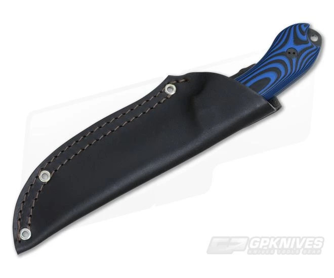 The Handle:Â Thick, 3D machined black/blue G10 handle scales are a pleasure to grip and fill the palm nicely. They are secured to the tang via 416 stainless custom fasteners heat treated to 40 Rc and dark tumbled.