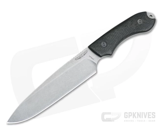 The classic Guardian6 fixed blade from Bradford Knives is a full sized tactical field knife that is ready for anything you can throw at it. Just big enough for chopping the G6 has a generous finger choil that allow for enhanced control needed for finer cutting tasks and provides an added guard when deployed for martial use. This version comes with smooth, 3D Contoured Carbon Fiber scales and a Sabre Ground Stonewashed finished, CPM-3V blade.