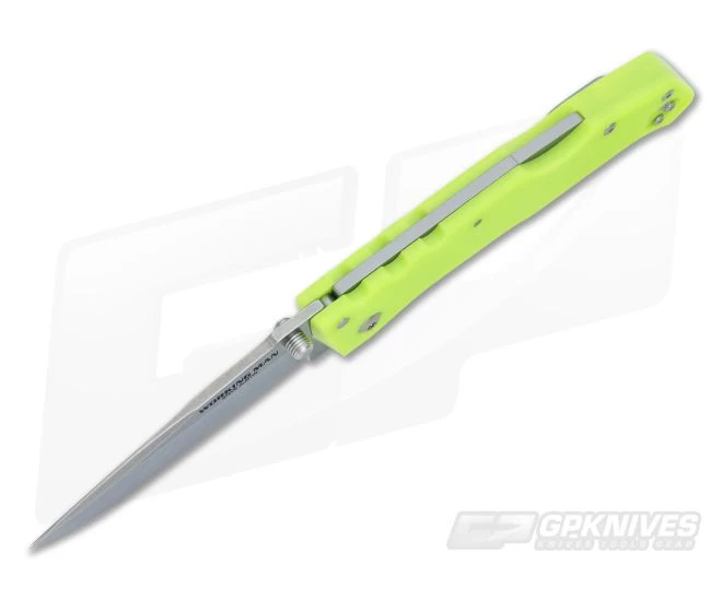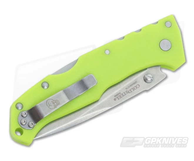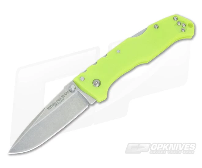 The Handle: A GFN polymer handle offers lightweight dependability and strength. It has light stone texturing and grooves to melt in most medium to large palms. This version has a snazzy Neon Green color and three large notches on the spine to aid in grip. The Working Man is equipped with a stonewashed Broken Skull pocket clip that’s reversible for left or right hand tip up carry.