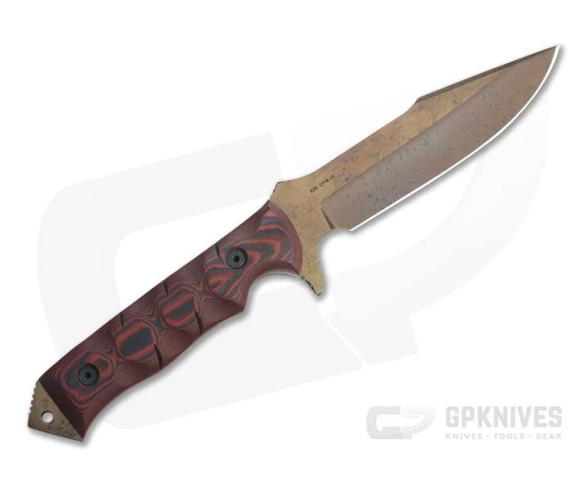 Sleek and fast, the Dawson Mojave 6 is a contemporary clip point Bowie with an aggressive style thanks to the exposed pommel and harpoon swedge. The Mojave 6 is a combat ready blade with excellent balance and speed. Outfitted with a powerful hollow grind and piercing point, this is an effective tool for field use in any task. Dawson utilizes American-made, CPM 3V powder metallurgy steel which offers exceptional toughness with edge holding up to three times longer than D2 and a clear Cerakote coating for corrosion resistance. This version comes with layered red and black G10 handle scales and an Arizona Copper finished blade.