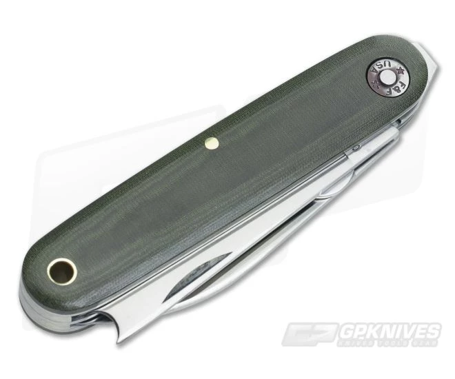 The Handle:Â A little over a half inch thick in totality, construction consists of durable Green linen micarta and stainless steel liners. All is secured with a brass lanyard tube, pins and steel pivot pin. The micarta is smooth for a comfortable feel in-hand while the olive drab, earthy coloring will be right at home in any workspace.Â
