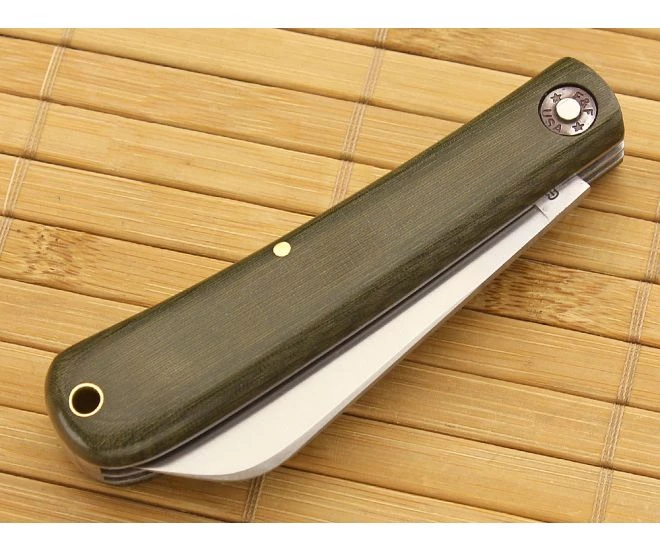 The Handle:Â The sturdy construction begins with stainless steel liners for each blade and a steel pivot pin. The chamfered edge linen micarta scales are attached with brass lanyard tube and pints. The smooth finished scales are both shrink and crack resistant and the implementation of a slightly raised back gives a nice feel in the hand.
