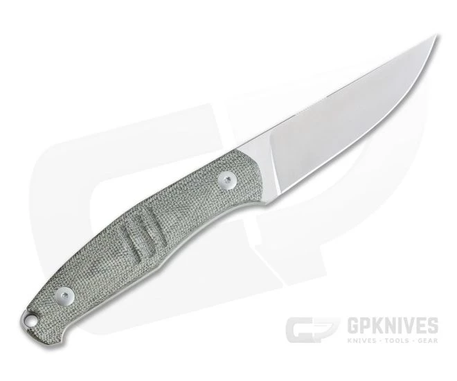 Handle:Â Contoured, blasted canvas Micarta handle scales are supported by the full tang construction providing a comfortable and secure grip that delivers traction even when wet. The spine of the tang is crowned around the handle for even better in hand feel. A relatively neutral design, the handle is comfortable in multiple grips and has milled grooves for indexing a traction with an exposed tang lanyard hole at the pommel.
