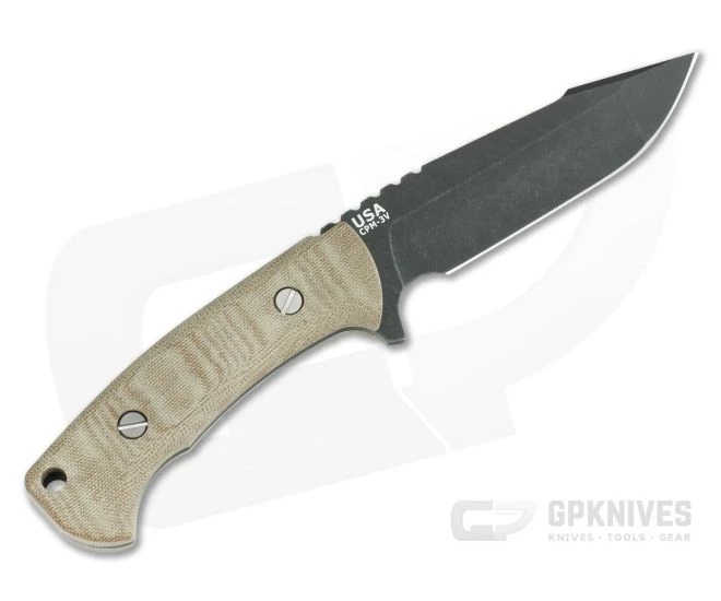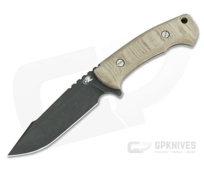 Handle: Beefy, 3D Machined Natural Canvas Micarta handles fill the hand in any grip and offer a secure and ergonomic handle without the need for aggressive traction. A “bird’s head” style pommel that allows for a secure “pinky” finger grip that enhances control and security in the hand. The handle is attached with sturdy flat head bolts that allow for easy removal of the scales for cleaning and maintenance. A generous hole is provided for lanyard attachment.