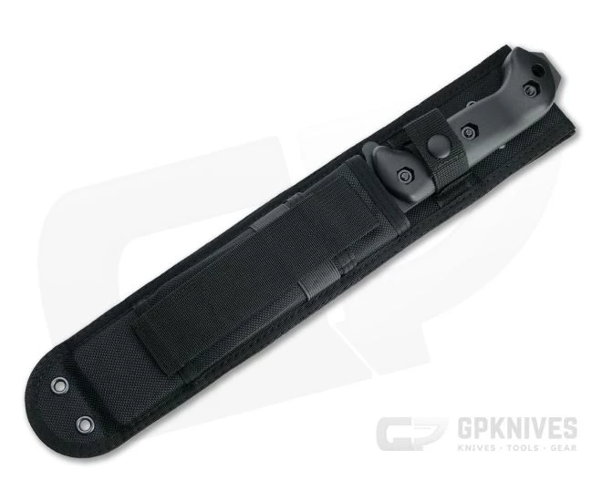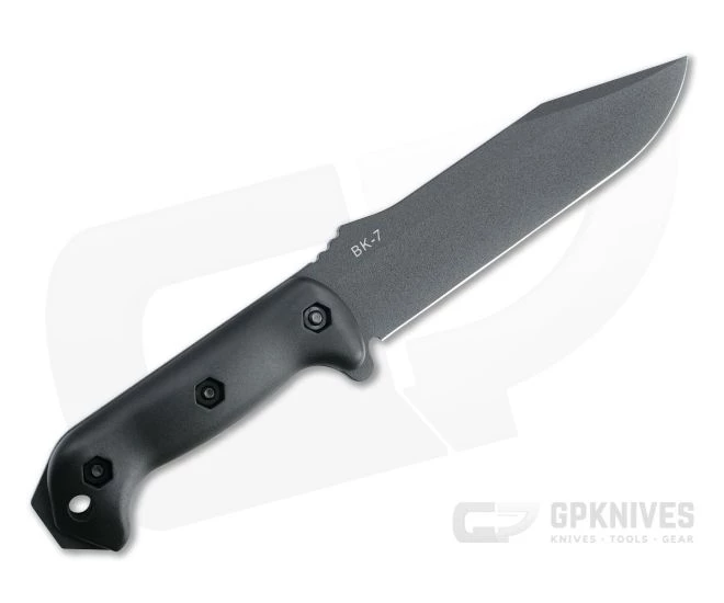 Kabar Becker Knife and Tool BK7 Combat Utility knife with black coated plain edge 1095 Cro-Van carbon steel blade and Zytel handles. All-purpose tool has a clip point blade style with full tang construction and lanyard hole. Heavy duty polyester sheath with hard plastic liner accommodates BK13 Remora small skeletonized knife (sold separately). Brand new direct from Kabar Knives.