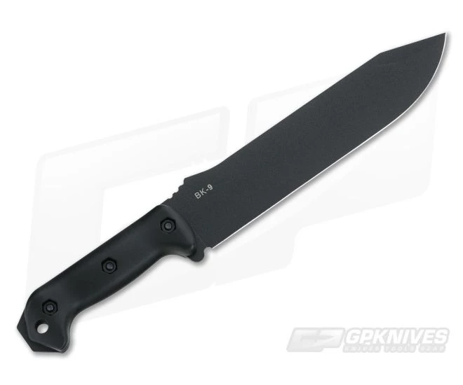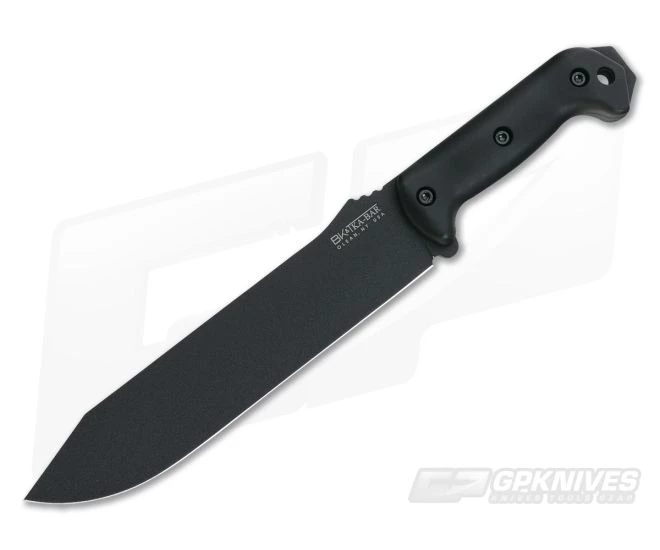 Kabar Becker Knife and Tool Combat Bowie with black coated plain edge 1095 Cro-Van carbon steel blade and Zytel handles. American Bowie-styled blade has full tang construction and lanyard hole. Heavy duty polyester sheath with hard plastic liner accommodates BK13 Remora small skeletonized knife (sold separately). Brand new direct from Kabar Knives.