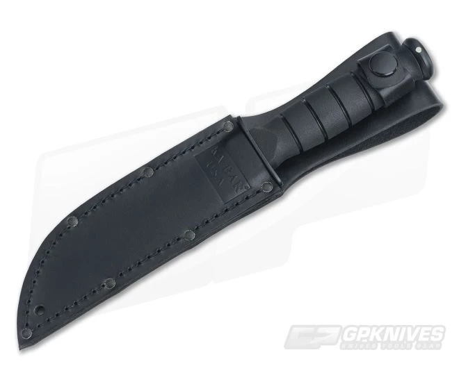 Kabar Short 1256 Knife with black coated plain edge 1095 Cro-Van blade and black kraton G handle. Stainless steel butt cap and guard. Black leather belt sheath.