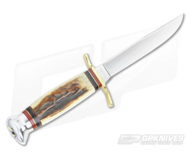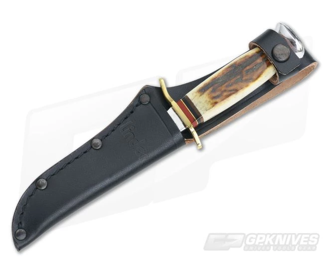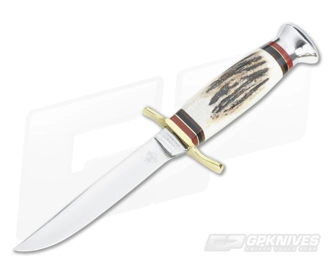 Linder Farmer clip point traditional hunting blade with stag handle. Multi piece handle has a brass double guard and one piece of round stag with aluminum pommel. This made in Solingen Germany knife has excellent fit and finish with a polished carbon steel blade. Small size makes for a great every day tag along knife. Includes a brown leather belt sheath with snap strap.