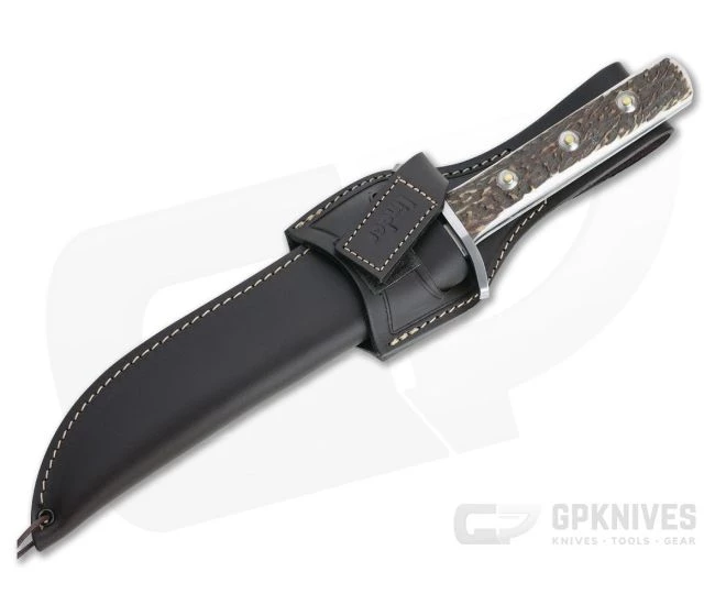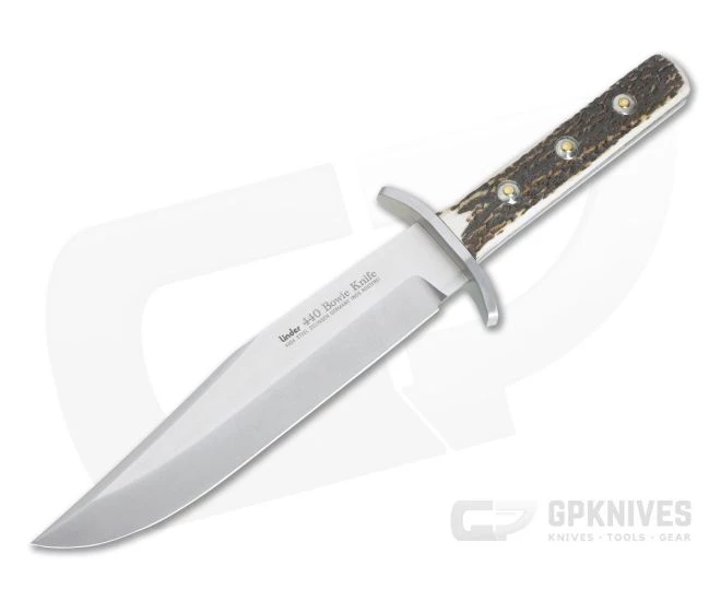 Linder Knives produces a variety of classic knife patterns with high quality German production and materials. This Solingen Classic Bowie from the City of Blades is made from satin finished stainless steel with a robust stag handle, and stainless steel double guard.