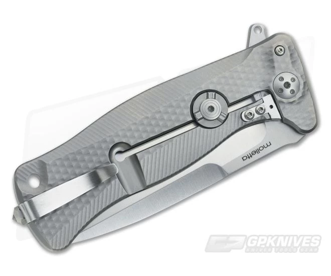 The Handle: Integral. It’s built from a single, unique piece of Titanium completely worked using 4-axis machining. This texturing has been taken up a notch or two from the SR-1. It feels fantastic and is in no way aggressive. The single piece is matte grey finished and comes complete with a frame locking mechanism plus Rotoblock system. That’s your lock bar stabilizer that, if spun, will completely block or lock your bar in the open position. This, in essence, turns your folder into a fixed blade. Once spun back the other way, you are free to release the lock bar. Pretty cool. A lanyard hole is built into the handle.