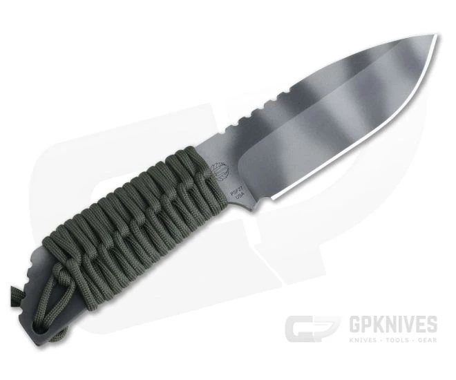 Handle: The Green Paracord wrapped handle fills the hand nicely with a high center ridge and provides a lanyard extension off the bottom. This model has a “Strider” style handle that provides for a secure grip while the aggressive spine jimping enhances traction in multiple grips. It will hold up well in the elements and the paracord is easily replaceable.