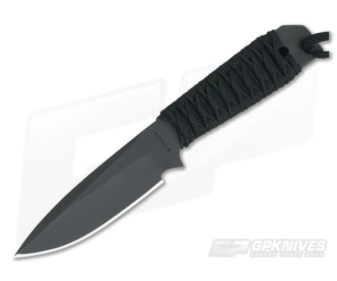 The WP model by Strider Knives is a compact, lightweight fixed blade option that you can strap to your pack or person and hardly notice until you need it. These are all hand ground from Hitachi ATS-34 and Black coated featuring a black Paracord wrapped handle. The same Strider bite in a smaller, more concealable package.