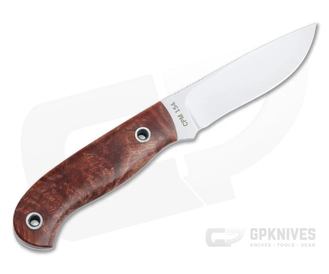 The Mike Irie Custom Model 110 lightweight hunter is an ideal size for hunting, woodcraft or daily carry or as a mid-sized fixed blade for any collection. Mike Irie is renowned for his hand ground blades and his Custom Model 110 showcases his skill and attention to detail. This version comes with a hand rubbed satin CPM-154 stainless steel drop point blade and dyed stabilized Maple burl wood handle scales.