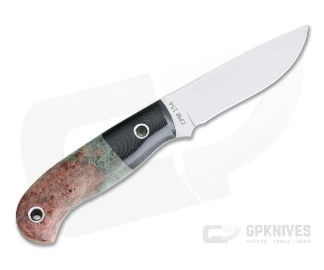 The Mike Irie Custom Model 110 lightweight Hunter is an ideal size for hunting, woodcraft or daily carry or as a mid-sized fixed blade for any collection. Mike Irie is renowned for his hand ground blades and his Custom Model 110 showcases his skill and attention to detail. This piece comes with a hand rubbed satin finished blade of CPM-154, polished Black Linen Micarta bolsters and Stabilized Maple Wood handles.