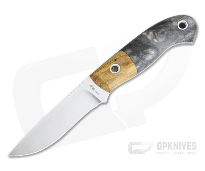 The Mike Irie Custom Model 110 lightweight Hunter is an ideal size for hunting, woodcraft or daily carry or as a mid-sized fixed blade for any collection. Mike Irie is renowned for his hand ground blades and his Custom Model 110 showcases his skill and attention to detail. This piece comes with a hand rubbed satin finished blade of CPM-154, maple bolsters and dyed stabilized Buckeye Burl Wood handles.