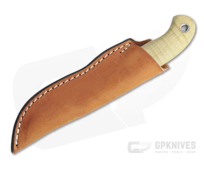 Handle:Â Simple and ergonomic, the stabilized Maple wood scales are fully contoured for a hand filling handle that is comfortable in nearly any grip and flush fit to black linen Micarta bolsters for a classic look. The subtle guard, generous palm swell and birds beak pommel help secure the knife in your grip while still allowing for comfort and maneuverability for a variety of tasks. This piece comes with stabilized Flame Maple wood handles that are highly figured for a stunning look. Dual polished stainless steel tubes fix the handle and allow for lanyard attachment.
