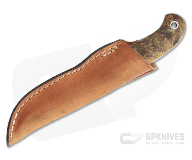 Handle:Â Simple and ergonomic are perfect words to describe the handles of the Irie 110. The subtle guard, generous palm swell and birds beak pommel help secure the knife in your grip while still allowing for the knife to be comfortable in multiple grips and easily maneuverable for a variety of tasks. This piece comes with polished Black Linen Micarta bolsters and a beautiful, stabilized dyed Maple Burl wood handle. A large, polished stainless steel tube is provided for lanyard attachment.
