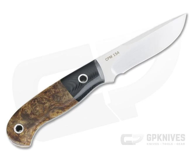 The Mike Irie Custom Model 110 lightweight hunter is an ideal size for hunting, woodcraft or daily carry or as a mid-sized fixed blade for any collection. Mike Irie is renowned for his hand ground blades and his Custom Model 110 showcases his skill and attention to detail. This version comes with a hand rubbed satin finished, Spear Point CPM-154 blade, polished Black Linen Micarta bolsters and Stabilized Dyed Maple Burl Wood handle scales.
