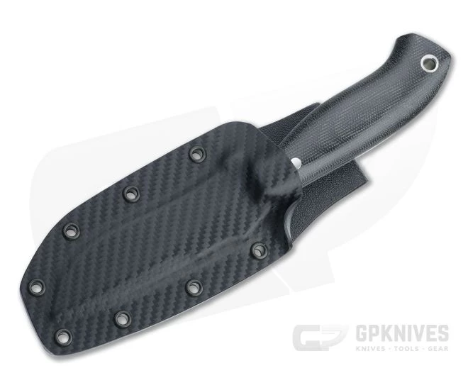 Carries via a 3-layer carbon fiber textured Kydex sheath with integral belt loop and eyelets.
