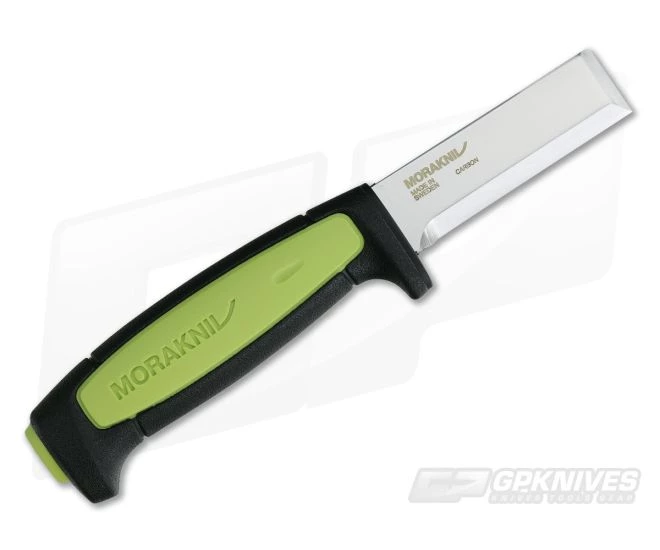 Mora of Sweden Pro Chisel C has a light green impact resistance polypropylene handle with a rubberized overmold. The Swedish carbon steel blade is completely flat with a knife edge and a chisel point. Inlcudes a black plastic molded sheath with belt clip and water drainage hole. Great tool for scraping and cutting duties.