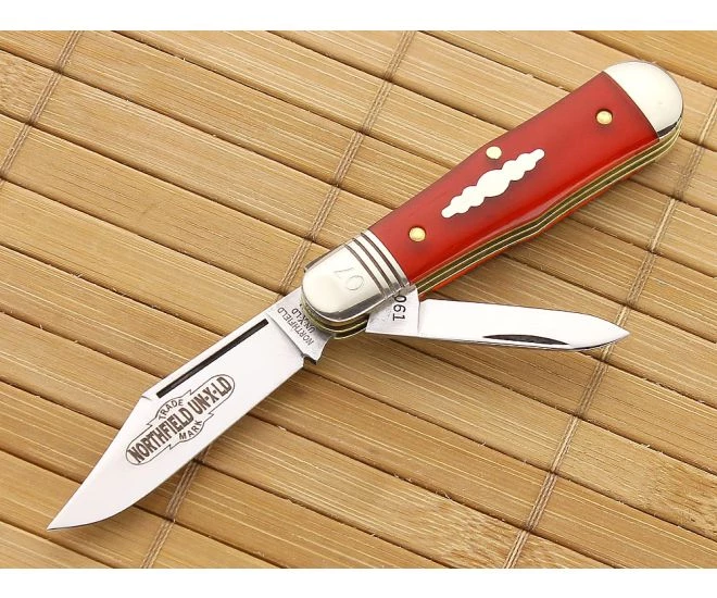 Northfield Cutlery #06 pattern with Cherry Soda Acrylic handles by Great Eastern Cutlery. Also known as the Pemberton pattern, this knife features two 1095 carbon steel blades (clip and pen) which were frozen forged and hammer tested before getting a polished finish. Marked “1 of 35” on the back of the primary blade. The handle is made of reddish cherry soda acrylic with traditional pinned shield, brass liners and pins. The primary pinched nickel silver bolster has been engraved with the knife’s serial number. These come in a unique tube packaging with company information on the front and signed Certificate of Authenticity. This is 1 of 35 produced.