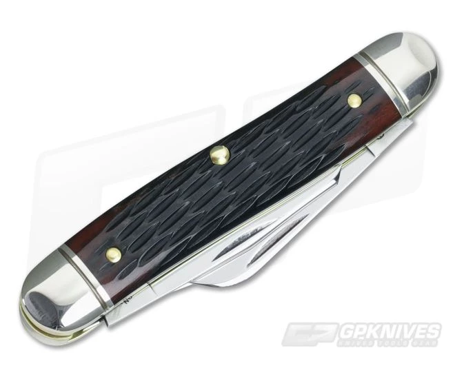 The Handle:Â The flawless brass liner construction for the #66 is enclosed by polished and crimped nickel silver bolsters at each end. Between the bolsters are two slabs of Hemlock Green Jigged Bone, more of a rich dark brown in color. The scales are pinned securely to the brass liners and adorned with a nickel sliver “badge” shield on the display side.