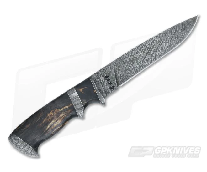 The Blade: Traditional drop point blade has been shaped from High Carbon Vanadium Damascus (HCVD) steel that utilizes Olamic’s proprietary process for excellent edge retention and ruggedness. The hidden tang marbled damascus patterned blade has been flat ground offering great slicing and utility capabilities.