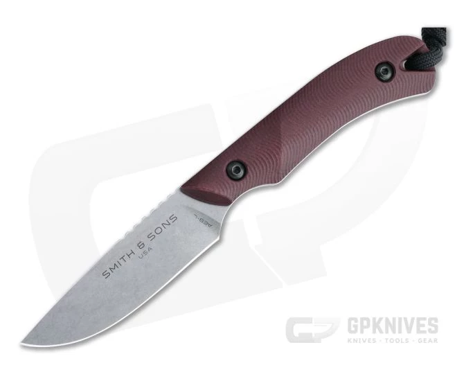 The Axiom from Smith & Sons is an everyday carry fixed blade designed for versatile utility. Compact and easy to carry the Axiom makes a good backup or reliable replacement for your folding knife. Streamlined and refined, the Axiom V2 comes with a smooth tumbled finish on the AEB-L blade with textured and contoured handle scales without liners. This version has burgundy Richlite scales.