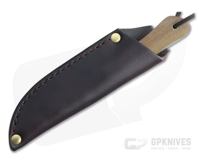 Handle: Flared brass pins securely attach the rugged natural canvas Micarta handle scales to the full tang. Shaped and contoured for comfort, this handle is designed for extended use, with an index cutout and pommel swell for a secure grip and enhanced traction from the Micarta. An attached leather lanyard provides added security and grip in use.
