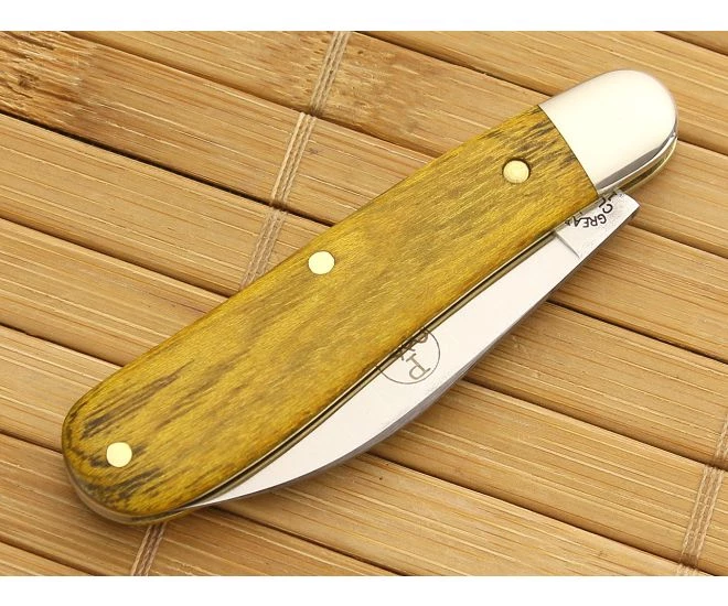 The Handle:Â Smooth Osage Orange Wood handle scales are pinned to brass liners and offer a unique appeal. A single nickel silver bolster and pointed shield finish off the Coyote.