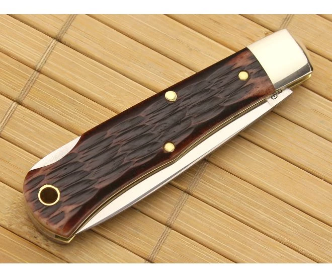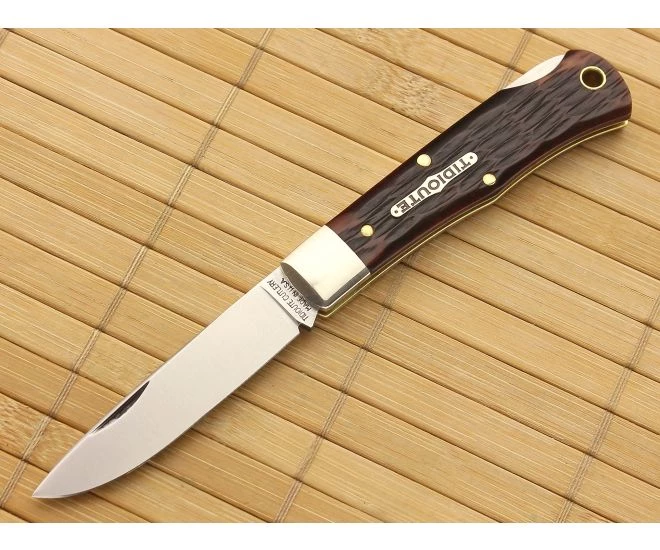 Tidioute #83LB Tascosa Little LockBack pattern is a single blade folder with Purple Sage Jig Bone handle scales and lock back mechanism. The Tascosa has one drop point satin finished 1095 carbon steel blade attached to a single nickel silver bolster. The Tascosa is lightweight, thin and smooth functioning perfect for daily carry. Continuing with the Tidioute tradition, are jigged bone handle scales pinned to the brass liners and a pinned “Tidioute” traditional shield. Each knife comes in unique tube packaging with company information on the front. Brand new direct from Great Eastern Cutlery.