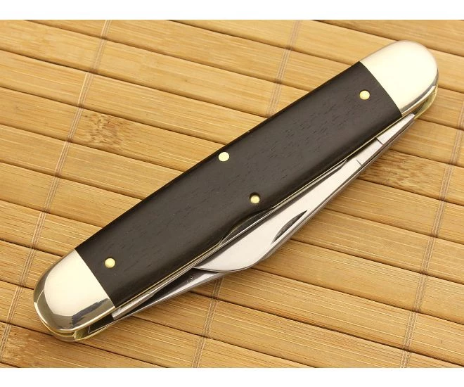 Smooth gabon ebony wood handle scales are pinned to brass liners and meet flush with thick nickel silver bolsters. Finished with a smooth, Traditional shield.Â