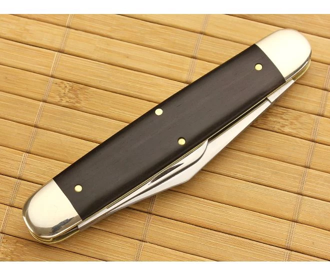 Smooth gabon ebony wood handle scales are pinned to brass liners and meet flush with thick nickel silver bolsters. Finished with a smooth, Traditional shield.Â