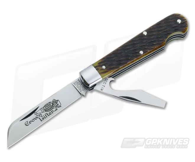 The Blade:Â Unbelievably useful sheepfoot style giving the user nearly 2.5 inches of cutting edge to tackle most daily chores. Built from easy-sharpening, hard working USA high carbon steel with a nice upper swedge grind down the latter half towards the tip. The Crown Lifter logo is engraved on the front and is opened via a nail groove pull about 3/4 of the way down. It has a defined half stop and is smooth opening. In front of the blade is the bottle opener lever or tool. It also has a half stop during opening and has the same finish as the blade. They make quite a team!
