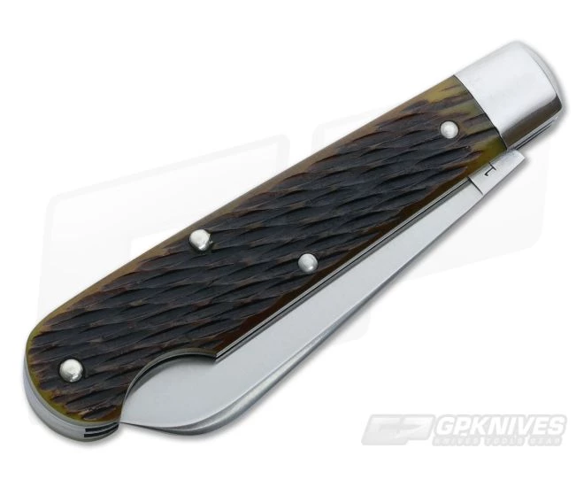 Fresh new #15 Huckleberry Boys Knife with Cap Lifter and rugged Antique Yellow Jig Bone handle scales direct from Great Eastern Cutlery. This version of the Boys Knife becomes such a handy tool with the addition of the crown or cap lifter as it not only pops your favorite tops, but also its tip can be used as a flat head screwdriver.