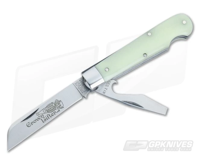 The Blade:Â Unbelievably useful sheepfoot style giving the user nearly 2.5 inches of cutting edge to tackle most daily chores. Built from easy-sharpening, hard working USA high carbon steel with a nice upper swedge grind down the latter half towards the tip. The Crown Lifter logo is engraved on the front and is opened via a nail groove pull about 3/4 of the way down. It has a defined half stop and is smooth opening. In front of the blade is the bottle opener lever or tool. It also has a half stop during opening and has the same satin finish as the blade. They make quite a team!