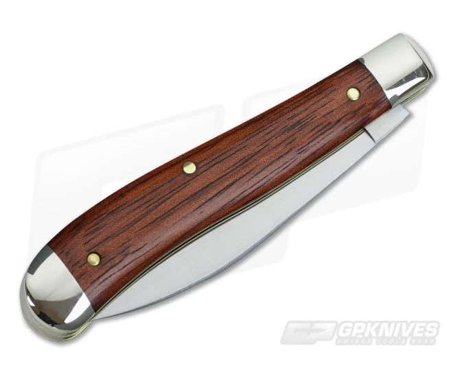 The Handle:Â Smooth Bloodwood handle scales have great character and fit the curved trapper pattern with precision. Construction consists of brass pins and liners with polished, flush nickel silver bolsters. Included is a classic “hot dog” shield pinned flat to the front of the handle.Â