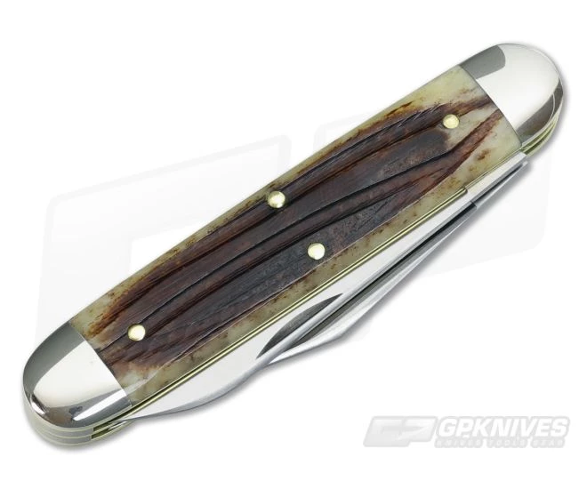 The Handle:Â Familiar GEC flawless construction on the #54. Brass liners and pins with polished nickel silver bolsters and shield. The clawed bone handle scales add handy texture feel to this traditional folder as well as a unique brown, wide grooved visual appeal to each knife.Â