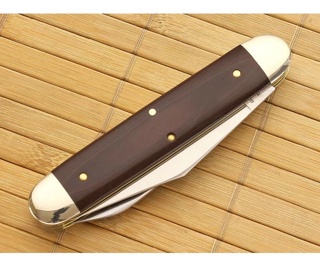 The Tidioute Cutlery equal end cigar pattern has two rounded bolsters with a center mounted smooth shield. This Big Jack has two 1095 carbon steel blades: a spear point and a clip point, each on their own back spring, Both blades share the same bolster and were frozen forged and hammer tested before receiving a satin finish. The handle on this model is smooth linen micarta in a dark maroon color. Traditionally made with nickel silver bolsters, brass liners, and a pinned on shield. These come in a unique tube packaging with company information on the front.
