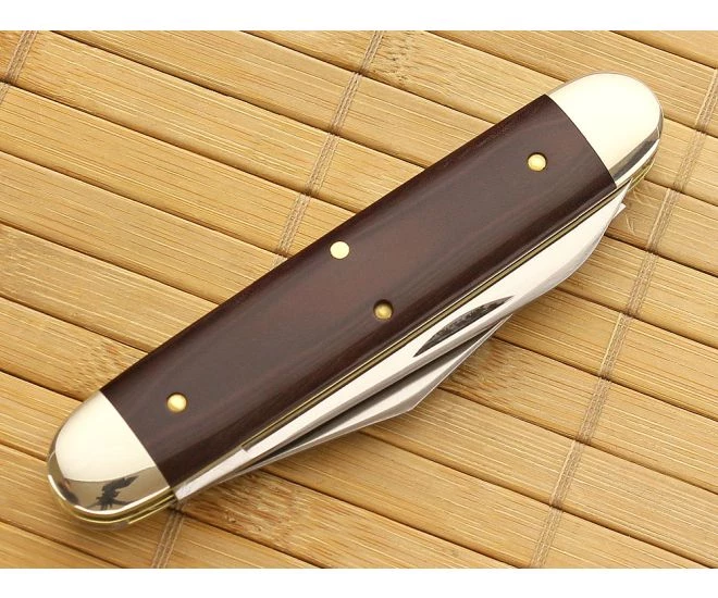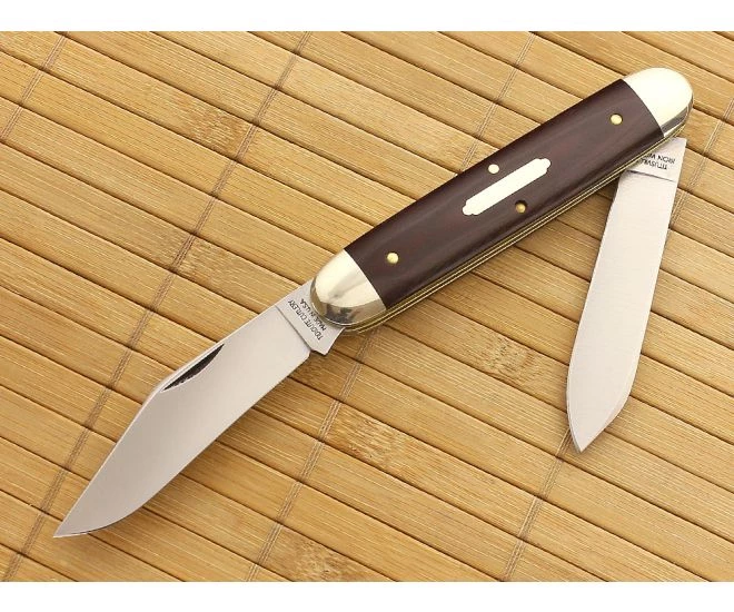 The Tidioute Cutlery equal end cigar pattern has two rounded bolsters with a center mounted smooth shield. This Big Moose has two 1095 carbon steel blades: a clip and spear point, each on their own back spring, Both blades were frozen forged and hammer tested before receiving a satin finish. The handle on this model is smooth dark maroon linen micarta which gives the knife a classy appearance. Traditionally made with nickel silver bolsters, brass liners, and a pinned on shield. These come in a unique tube packaging with company information on the front.
