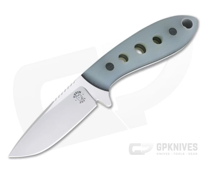 The TK-3 Whitetail Hunter fixed blade from custom maker Tom Krein is a classic fixed blade design with Krein’s signature ergonomic handle design and performance oriented blade grind. This drop point hunting knife is a slicing powerhouse offering nearly 3 inches of razor sharp cutting edge with an ergonomically designed handle that provides comfort and control. This version comes with a satin finished Nitro-V blade and speed hole milled, blasted Jade green G10 handle scales over black liners with black Micarta pins.