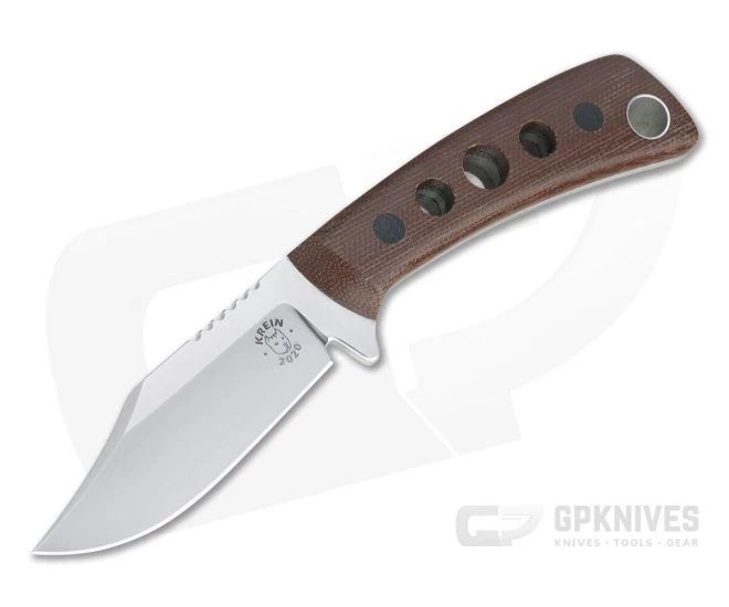 The TK-4 custom fixed blade from Tom Krein is one of Tom’s iconic signature designs with his highly ergonomic handle construction and performance oriented hollow ground blade. This Mini-Bowie is a slicing powerhouse offering just over 2.75 inches of razor sharp cutting edge in a compact, EDC platform. This version comes with a satin finished Nitro-V blade and Brown Canvas Micarta handles with speed hole milling and black Micarta pins.