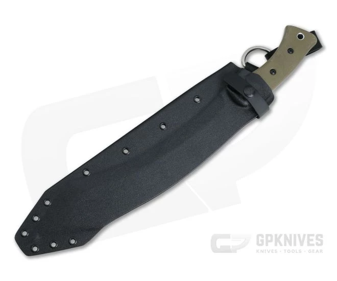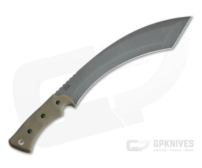 Handle:Â The full tang construction supports generous, contoured Green Canvas Micarta handle scales attached via black oxide stainless steel Allen bolts over black liners. A forward finger choil allows the user to choke up on the blade for control with a distal tapered handle that helps lock the handle in the hand for heavy chopping work. A hollow pin is provided for lanyard attachment.