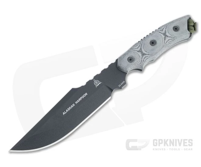Sought after by outdoor adventurers, wilderness survival experts and military personnel, the TOPS Alaskan Harpoon is a classic TOPS design with their signature combination of thick 1095 carbon steel, Black Traction Coating and black linen Micarta over white liners. This is a massive full tang fixed blade ideal for hard and heavy use while still being capable of handing fine tasks making it a versatile tool wherever adventure takes you.