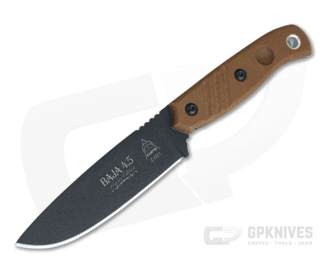A marriage of clean, simple design and high tolerance execution makes the Baja 4.5 from TOPS tough enough to rely on, even in extreme region from which it takes its name. This Reserve Edition retains the same 4.5 inch, full tang, 1095 carbon steel construction and Micarta scales for time-tested performance. A non-reflective, Black Traction powder coat finish enhances corrosion resistance while the Tan Canvas Micarta offers performance and rugged good looks that fit in nearly any environment.