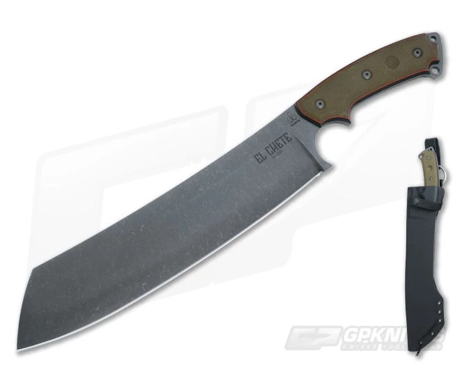 The El Chete chopper from TOPS Knives was built to demolish. Period. End of story. This blade is massive with a super thick blade that delivers cutting power comparable to a hatchet or small axe. Such a blade requires a fitting handle and the dual layered canvas Micarta will fill the hand and look good doing in the process. This version comes with a blade of Midnight Bronze Cerakote coated 1095 carbon steel with green and black Micarta scales and Kydex sheath with leather drop loop dangler.