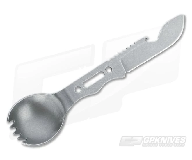 The TOPS FORK It is an eating tool designed by Leo Espinoza which was meant to serve as a lightweight alternative to your ordinary set of utensils. Its primary focus was on space and weight savings, as it allows the user to carry one tool when hiking or putting together an emergency bag where you might be limited on room. Made from 1095 carbon steel it has a spork at one end with a knife blade on the other which acts as the handle when covered by its kydex neck sheath. A handy built in bottle opener is also built in for those pesky bottlecaps.